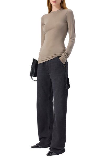 Свободные черные джинсы с высокой посадкой зададут образу непринужденное настроение. За это отвечают декоративные необработанные вырезы по бокам и плотный хлопок с заломами и небольшими потертостями. О принадлежности модели бренду, основанному Мартином Маржелой, говорят фирменные стежки сзади, заменившие традиционный жакрон.