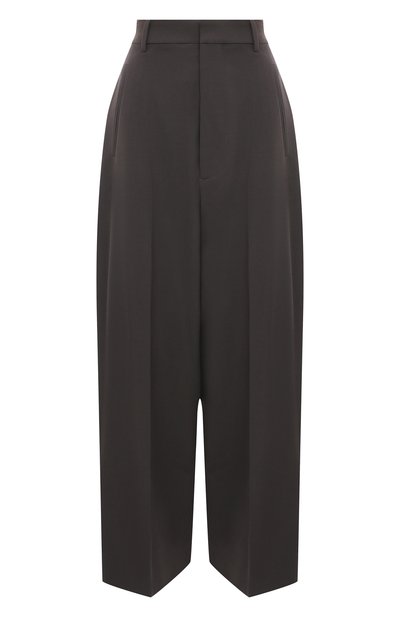 Мастера марки, основанной Мартином Маржелой, сшили утрированно свободные серые брюки из мягкого фактурного материала с добавлением шелковистой вискозы. Модель с завышенной посадкой и глубокими складками спереди дополнили прорезным карманом, расположив его под коленом сзади.