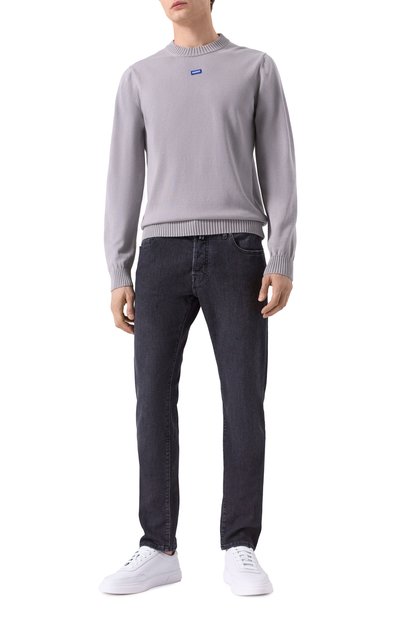 Джемпер San Cosmo-C связали из хлопковой пряжи. Модель с круглой горловиной, манжетами и поясом в рубчик украсили спереди брендированным патчем фирменного синего оттенка.