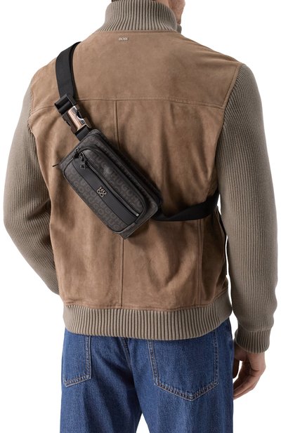 Черную сумку с широким регулируемым ремнем, застегивающимся пряжкой фастекс, удобно носить и на поясе, и на спине, как рюкзак. Аксессуар с двумя внешними карманами на молнии сшили из прочного текстиля, полиэстер для которого изготовили из переработанных пластиковых отходов. В модель, украшенную красным брендированным патчем, поместятся смартфон, портмоне, ключи и очки.
