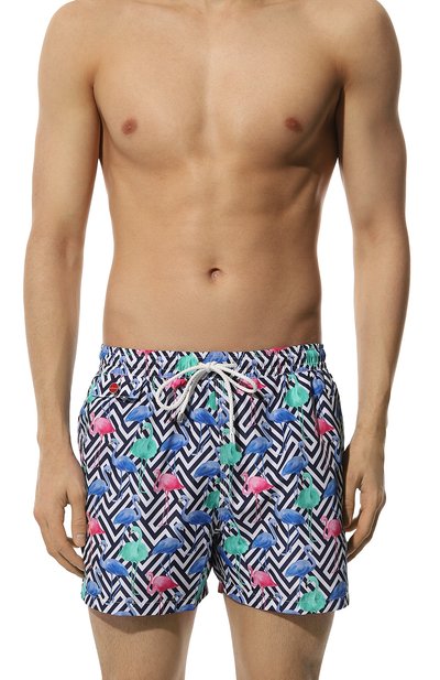 Плавки-шорты с фирменным зигзагообразным принтом быстро сохнут после купания. Модель с эластичным поясом дополнили тремя карманами: двумя прорезными по бокам и накладным задним с люверсами и клапаном с застежкой велк ро.
