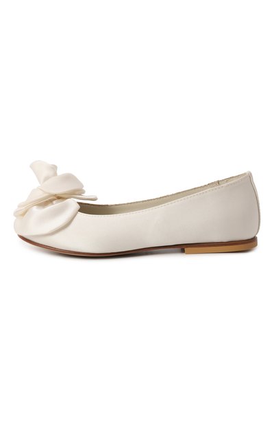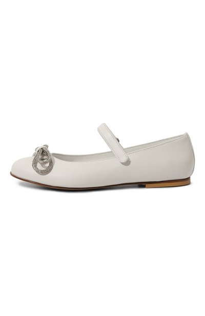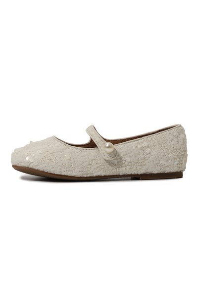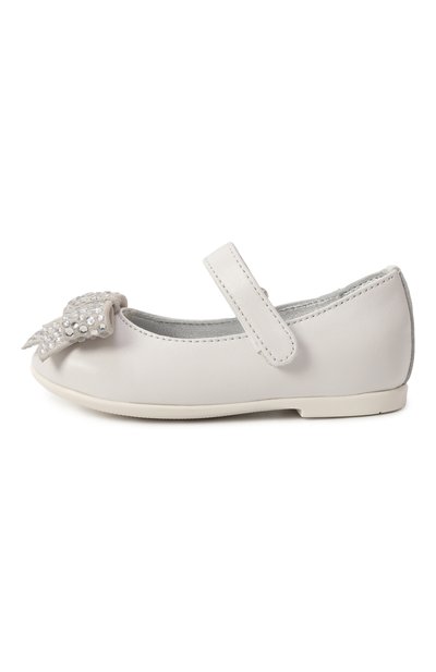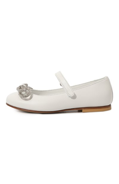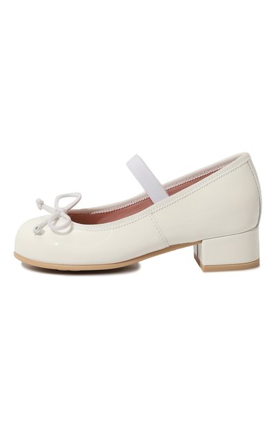 Молочно-белые балетки с круглым мысом, широким наборным каблуком и глубоким вырезом сшиты вручную из гладкой лакированной кожи с учетом особенностей строения растущей детской стопы. Однотонные туфли с анатомической стелькой фиксируются на ноге узким ремешком с пряжкой, украшенной кристаллами.