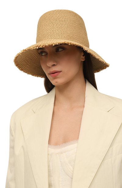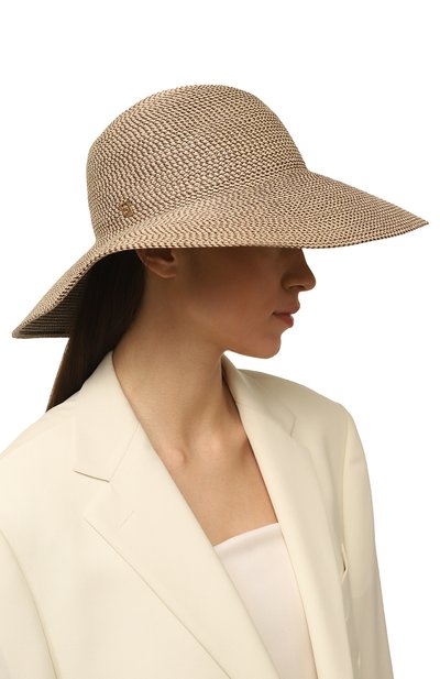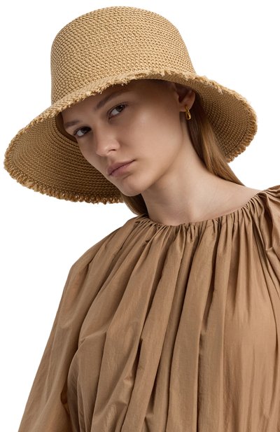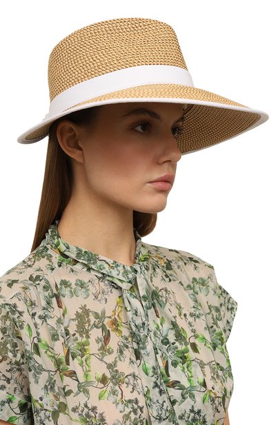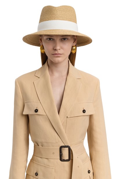 Полосатую шляпу с широкими покатыми полями вручную изготовили из прочной пеньки, поэтому аксессуар получился легким и дышащим, а после хранения в сложенном виде он быстро восстановит изначальную форму. Высокую тулью декорировали сбоку золотистой металлической накладкой в виде эмблемы бренда.