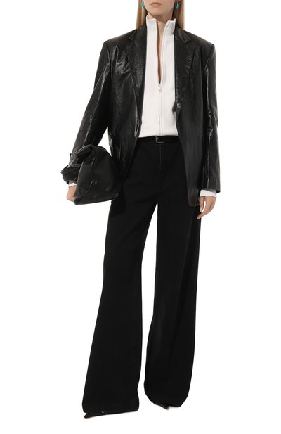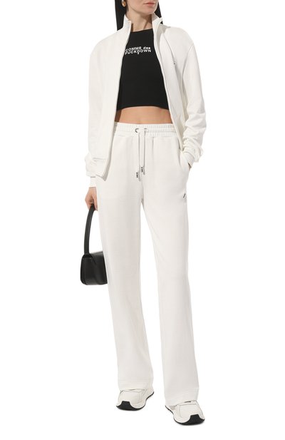 Белую толстовку с регулируемым капюшоном и накладными карманами сшили из мягкого хлопкового футера, хорошо удерживающего тепло тела. Графичность модели Лорена Антониацци придала полосатыми эластичными поясом и манжетами. Принадлежность марке обозначили патчем в виде звезды на рукаве реглан, подчеркнутым аппликацией из миниатюрных кристаллов.