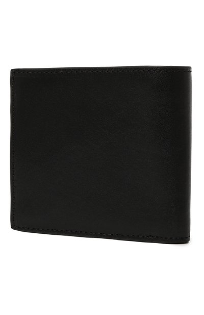 Для пошива лаконичного черного портмоне использовали пластичную промытую кожу наппа с небольшими потертостями. Внутри аксессуара предусмотрели восемь слотов для пластиковых карт, отсек для банкнот и четыре кармана для чеков и документов. Принадлежность бренду обозначили серебристым металлическим логотипом на передней панели.