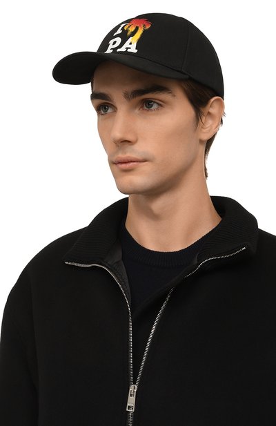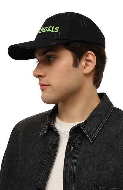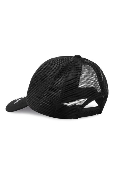 Черная бейсболка громко заявляет о принадлежности марке рельефной аппликацией в виде крупного прорезиненного логотипа. Для изготовления мод ели с широким козырьком использовали прочный нейлон. Аксессуар с прошитыми люверсами дополнили пластиковым ремешком, регулирующим посадку.