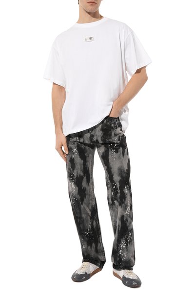 Свободную белую футболку со спущенной линией плеч украсили спереди контрастной надписью в виде логотипа и года основания бренда. Для пошива модели использовали мягкое джерси из отборного хлопка с прочными тонкими волокнами. Изделие из такого дышащего материала не вытягивается со временем и обеспечивает комфорт в теплую погоду.