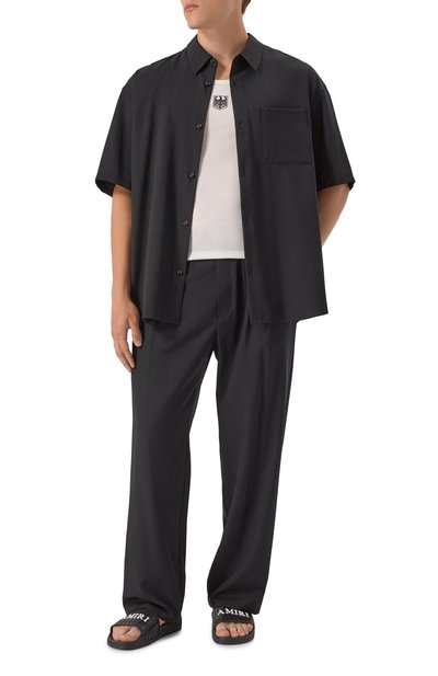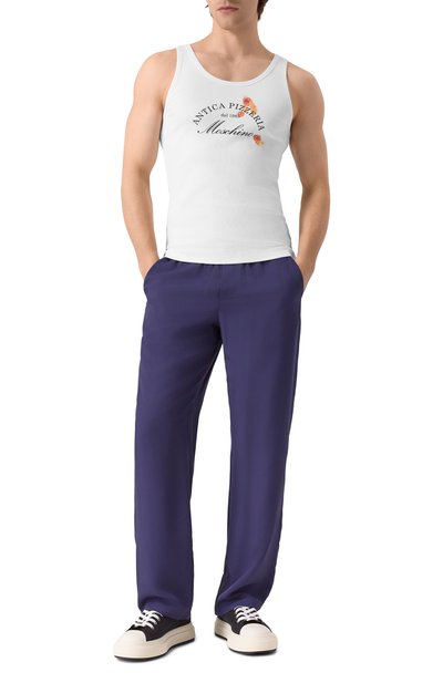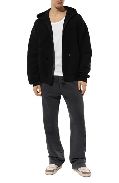Для пошива белой майки использовали мягкое дышащее джерси из отборного хлопка, которое хорошо пропускает воздух и обеспечивает комфорт в течение дня. Принадлежность изделия бренду, основанным Вирджилом Абло, обозначили небольшим контрастным логотипом, словно нарисованным при помощи трафарета.