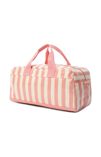 Небольшая светло-розовая сумка с одним отделением сшита из гладкого материала, напоминающего кожу с перламутровым блеском. Две короткие ручки и плечевой ремень из прочного текстиля украшены логотипами марки. В прямоугольный аксессуар поместятся заколки, расческа и небольшое зеркало.