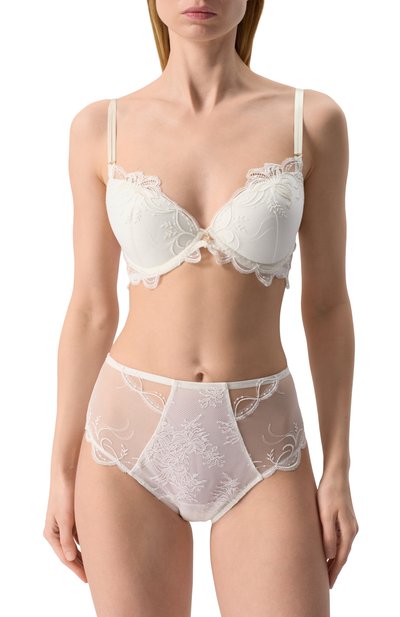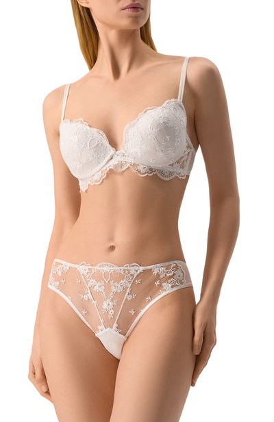 Для изготовления белых слипов с низкой посадкой использовали полупрозрачный эластичный тюль, поэтому они почти не ощущаются на теле и комфортно облегают. Клиновидную вставку спереди декорировали цветочным кружевом, добавляющим белью с фестончатым кантом фактурность.