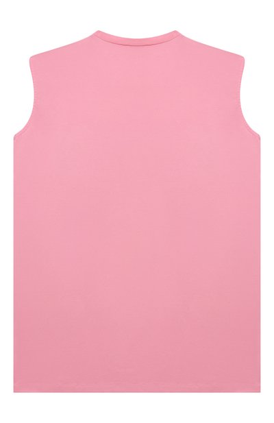 Синее платье без рукавов напоминает майку с круглой горловиной. Модель выполнили из тонкого хлопкового джерси, которое не вызывает раздражений на коже, не сковывает движения и поддерживает оптимальный микроклимат. Спереди изделие декорировали голубой круглой вставкой из такого же материала.