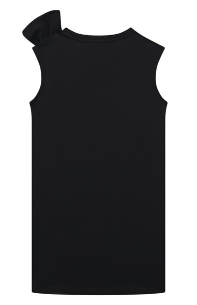 Синее платье без рукавов напоминает майку с круглой горловиной. Модель выполнили из тонкого хлопкового джерси, которое не вызывает раздражений на коже, не сковывает движения и поддерживает оптимальный микроклимат. Спереди изделие декорировали голубой круглой вставкой из такого же материала.