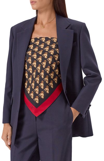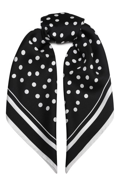 Квадратный черно-белый платок с узором polka dot и небольшим логотипом бренда на кайме стал частью коллекции, вдохновленной культурой Сицилии. Для изготовления модели выбрали шелковый твил — тонкий, но плотный материал с деликатным блеском красиво драпируется и быстро восстанавливает форму. Края изделия подрубили вручную.