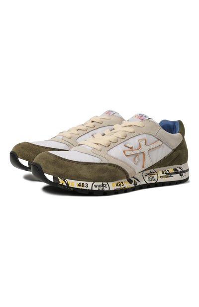 Кроссовки Zac цвета хаки выполнили из гладкого текстиля, который укрепили фигурными деталями из бархатистой замши и матовой кожи. По бокам разместили фирменные аппликации в форме иероглифов, а подошву со слоем из амортизирующего полимера EVA украсили принтом в виде штампов и печатей.