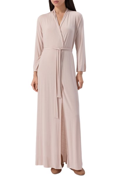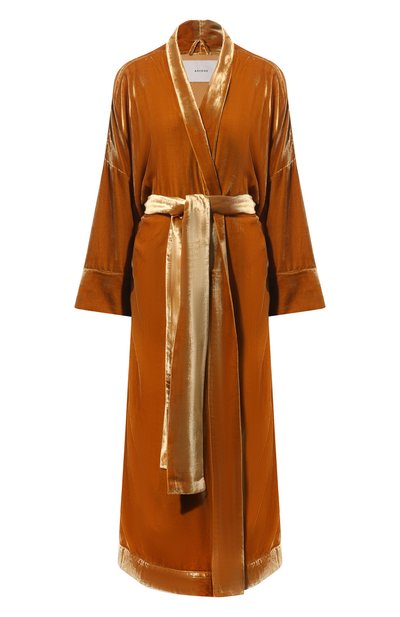 Для пошива оранжевого длинного халата с узким шалевым воротником и спущенной линией плеч использовали плотный вискозный бархат с добавлением прочного шелка. Плотный материал хорошо отражает свет, создавая игру полутонов и придавая модели элегантный блеск. Глубину запаха комфортно регулировать широким поясом-лентой.