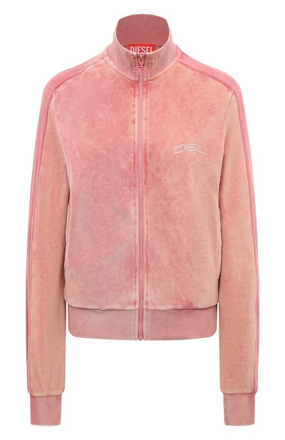 Розовая толстовка с высоким воротом словно прослужила не один сезон. Модель из мягкой хлопковой синели, хорошо удерживающей тепло, окрасили в готовом виде в технике распыления, создав неоднородный выбеленный оттенок. Изделие декорировали фирменной эмблемой, выложив ее прозрачными микрокристаллами сбоку.