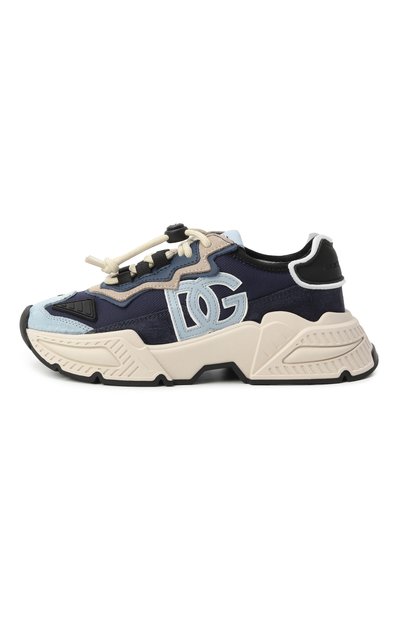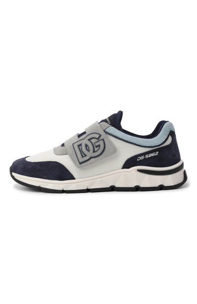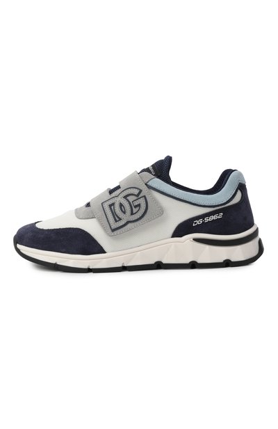 Темно-синие кроссовки выполнили из дышащей сетки и бархатистой замши, тонко выделанной для особенной мягкости. Чтобы пару было удобнее надевать и снимать, шнуровку заменили широким ремешком велкро, декорированным крупной монограммой DG. За комфорт при ходьбе отвечает гибкая легкая подошва, которая хорошо амортизирует и обеспечивает сцепление с любой дорогой.