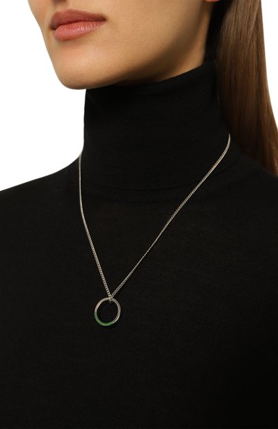 Белую подвеску выполнили в виде кольца, скрученного из витого шнура. Для создания крупной детали использовали ювелирный сплав, на который нанесли слой эмали, а большую реалистичность придали полосой из позолоты. Изделие дополнили тонкой длинной цепочкой с брендированной вставкой, которые изготовили из латуни с гальваническим покрытием серебром.