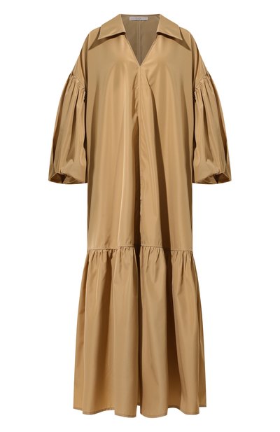 Свободное миди-платье карамельного оттенка придаст образу романтичности. Настроение поддерживают объемные рукава 3/4 и широкий волан на подоле. Для пошива изделия с отложным воротником и V-образным вырезом использовали легкую шелковистую тафту, которая приятно ощущается на теле и подчеркивает объемный силуэт модели.