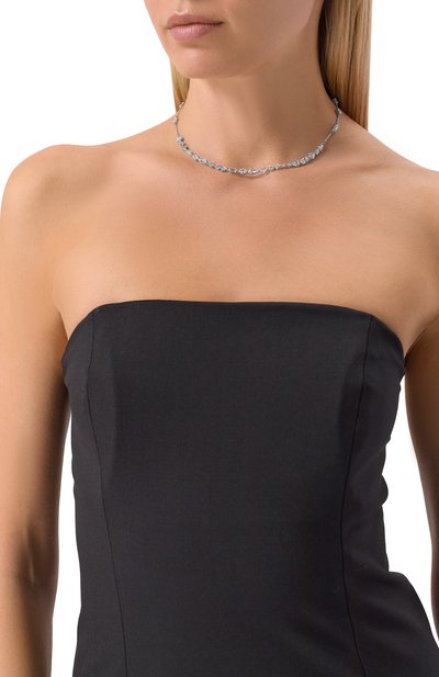 На этом чокере соединили две узкие цепочки с якорным и панцирным плетением. Ярусы из легкого ювелирного сплава покрыли родием в технике гальванизации, поэтому их холодный блеск не потускнеет со временем. Роль застежки отдали черной атласной ленте с брендированными металлическими эглетами.