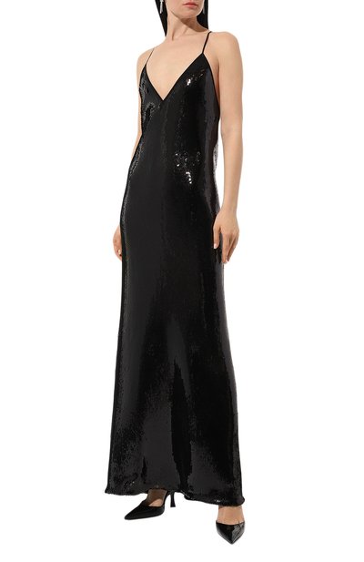 Черное платье-комбинацию с мягкой драпировкой на лифе сшили из струящейся ткани на основе тонкого ацетата и гладкого полиэстера. Наши стилисты предлагают поддержать ее благородный блеск перламутровым сиянием жемчужных бусин крупного колье и цепочки на союзке элегантных сандалий. Высокие боковые разрезы эффектно открывают ноги. Слайдеры на узких бретелям помогут отрегулировать посадку.
