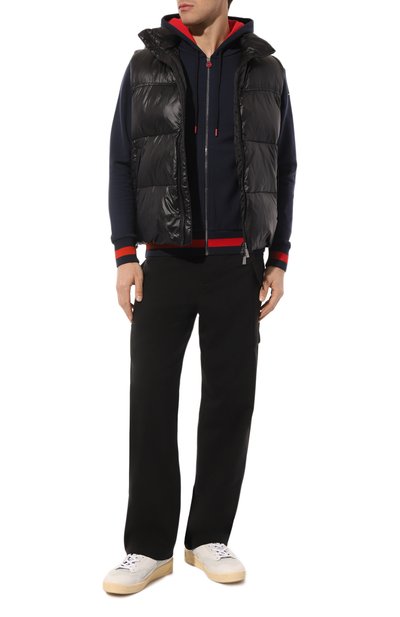 Черную толстовку с крупными карманами выполнили из приятного на ощупь хлопкового трикотажа, который поддерживает комфортный микроклимат. Широкие манжеты и пояс украсили красными полосами. В тон им — брендированный пуллер молнии, внутренняя отделка капюшона и эглеты на шнуре, который продели в его кулиску. На левом рукаве — небольшой логотип марки.