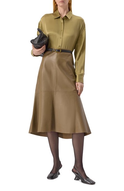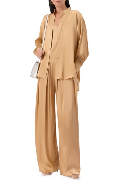 Песочно-бежевая блуза будет одинаково хорошо смотреться и в наряде для офиса, и в повседневном образе. Например, наши стилисты предлагают носить ее с водолазкой, пиджаком и брюками. Для пошива модели с отложным воротником использовали мягкий шелковый твил, который почти не мнется и едва ощущается на теле. Изделие застегивается пуговицами, скрытыми под узкой планкой.