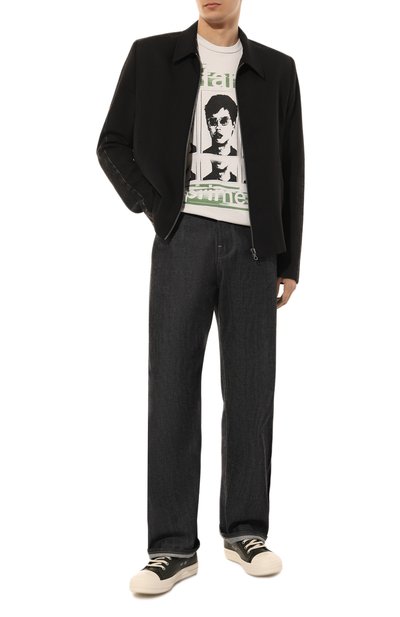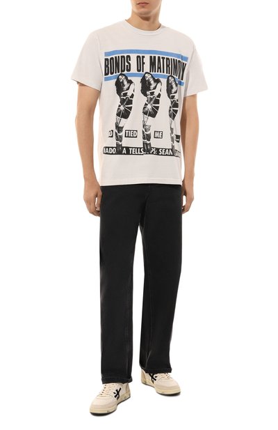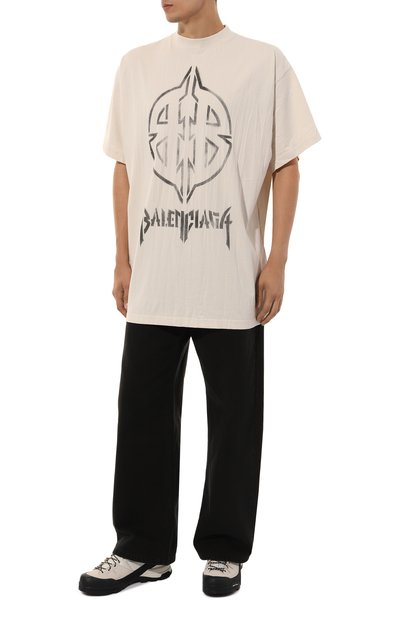 Футболка кремового оттенка приобрела состаренный вид. Иллюзию формирует неравномерное окрашивание материала. Для пошива модели силуэта oversize использовали легкое хлопковое джерси. Спереди изделие украсили нашивками в виде герба и логотипа, поверх которого разместили аппликации в форме литер.