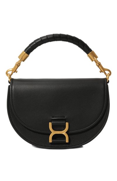 Черную сумку Marcie, вдохновленную атрибутами для верховой езды, выполнили из нежной наппы ягненка, крупнозернистой телячьей кожи и бархатистой замши. Откидной клапан аксессуара полукруглой формы декорировали фирменной фигурной пряжкой оттенка античного золота. В модель со съемными п летеной ручкой и плечевым ремнем-цепочкой поместятся ключи, картхолдер и смартфон, во внутренний карман — зеркало.
