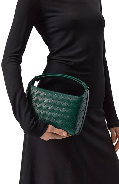 Крупная бусина с золотым покрытием на ярко-зеленой сумке Turn играет не только декоративную, но и функциональную роль. Если ее опустить, ручка стянет углы модели и изменит ее силуэт. Трансформироваться аксессуару помогает мягкая конструкция, созданная в технике intreccio ad inserto из нежной кожи ягненка. В изделие с замшевой внутренней отделкой п оместятся портмоне, смартфон и ключи.
