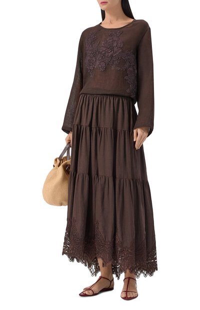 Широкий шнур обрамляет круглую горловину свободной блузы и превращается в завязки над V-образным вырезом. Акцентную деталь вручную сплели из отрезов того же коричневого льняного газа, который использовали для пошива самой модели с пышными рукавами реглан. Тонкая, чуть просвечивающая ткань с жатой фактурой почти ничего не весит и обеспечивает эффективную циркуляцию воздуха.
