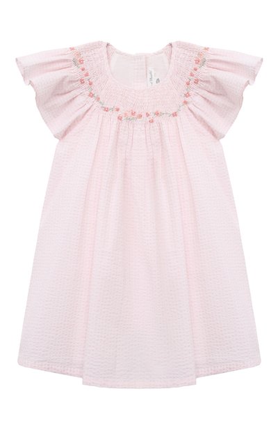 Свободное светло-розовое платье в мелкую клетку сшили из тонкого сирсакера с характерной фактурой, полученной неравномерным натяжением нитей в полотне. Для производства ткани использовали нежный безопасный для кожи хлопок, поэтому изделие с пуговицами на спинке хорошо пропускает воздух. Рукава-крылышки и мелкая цветочная вышивка на эластичном лифе делают модель с расклешенным подолом немного наряднее.