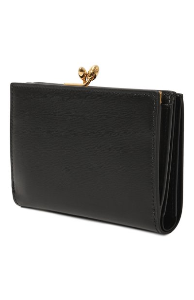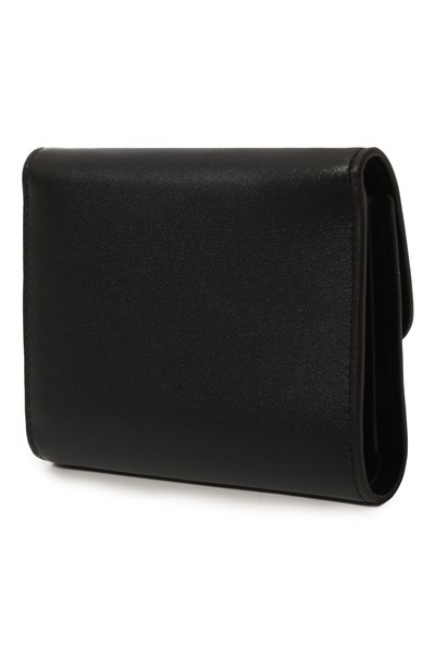 Черный кошелек выполнили из фактурной кожи ягненка Puffy Arena. Чтобы подчеркнуть рельеф, материал бережно отполировали до шелковистого блеска. Переднюю панель украсили золотистой эмблемой бренда. Аксессуар с отделением для купюр дополнили четырьмя слотами для карт внутри и одним — снаружи. Также предусмотрели карман для монет.