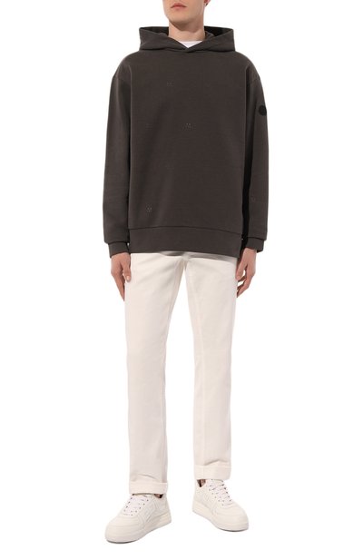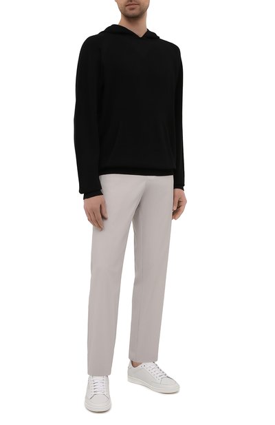 Для пошива черного свободного худи со спущенной линией плеч использовали мягкое хлопковое джерси. В состав эластичного материала с плотным плетением добавили нежный благородный кашемир, поэтому модель получилась легкой и при этом более теплой. Объемный капюшон дополнили серебристыми брендированными кнопками.