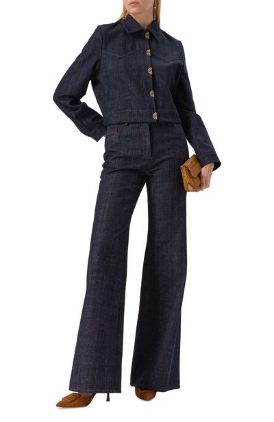 Джинсовую куртку с прямоугольными манжетами и четырьмя карманами сшили из жесткого хлопкового денима. Пояс с регулируемыми ремешками по бокам украсили паттерном из эмблемы Triomphe, выложенным серебристыми заклепками.