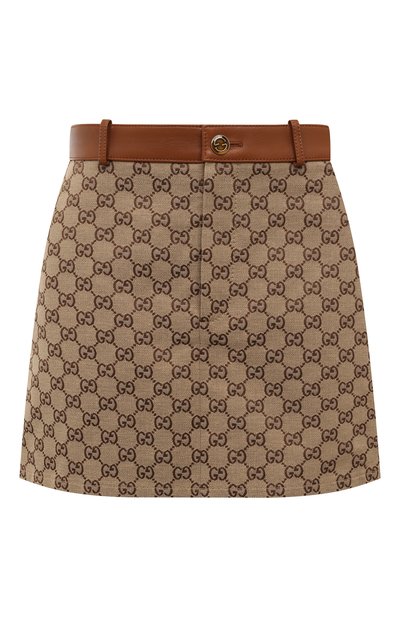 Бежевая мини-юбка со знаковым паттерном из монограммы GG, составленной из инициалов Гуччио Гуччи, органично впишется в образ с парным жакетом. Для пошива модели с прорезными карманами использовали мягкую хлопковую ткань, которая мало мнется и хорошо держит форму. Изделие дополнили коричневым поясом со шлевками, выполненным из мягко й кожи ягненка.
