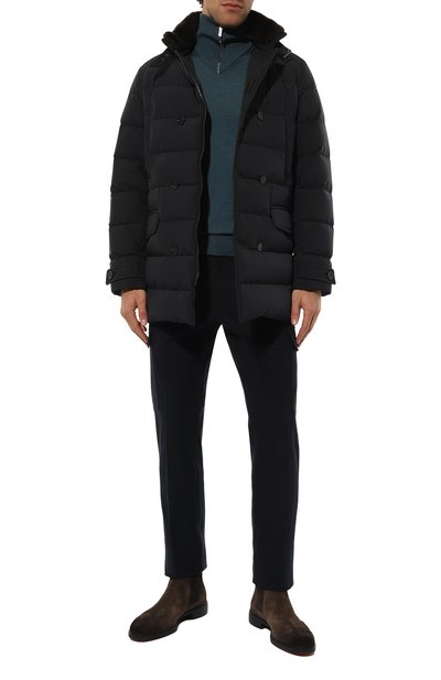 Для пошива черного прямого пуховика с повторяющимися логотипами бренда использовали непродуваемый и непромокаемый полиэстер. Стеганую модель, застегивающуюся встречной молнией, дополнили двумя боковыми карманами и одним накладным на рукаве. За тепло отвечает объемный и при этом легкий слой отборного пуха с добавлением пера. Защиту от непогоды также обеспечивает тонкий капюшон, спрятанный в высоком воротнике-стойке.