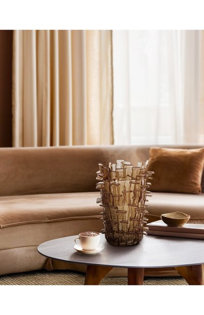При создании футуристичной вазы Ritagli венецианские мастера использовали трудоемкую технику, разработанную Фульвио Бьянкони в 1989 году. Тонкие прямоугольные полоски муранского стекла накладывают одну на другую поверх выдуваемой и обрабатываемой вр учную основы — в результате получается сложносочиненный узор, уникальный для каждого изделия. Насыщенный и глубокий желтый оттенок аксессуара сообщает о его принадлежности коллекции Ginkgo Biloba. Модель выпущена тиражом 99 экземпляров.
