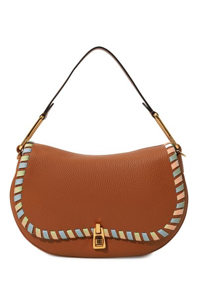Коричневую сумку Magie с короткой ручкой изготовили из тонко выделанной крупнозернистой кожи, устойчивой к появлению потертостей и царапин. Фигурный клапан модели с поворотным замком из золотистого металла украсили разноцветной отделкой по контуру. В аксессуар с внутренним карманом на молнии поместятся кошелек, смартфон и ключ. В комплекте — плечевой ремень.