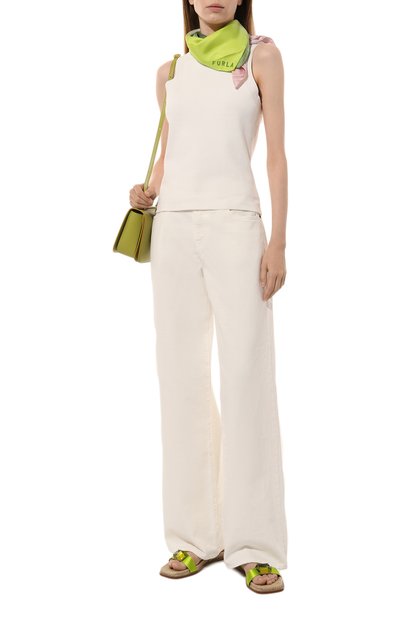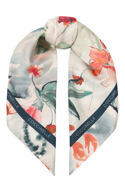 Квадратный платок делает эффектным мотив Water flowers, словно выполненный акварелью. Рисунок дополнили рамкой из узких брендированных полос. Для создания аксессуара использовали легкий струящийся шелковый твил, деликатный блеск которого придает принту особую выразительность.