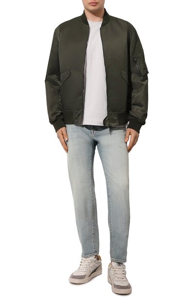 Светло-голубые зауженные джинсы с декоративными заломами и потертостями сшили из слегка эластичного хлопка, выстиранного с камнями. Изделие, застегивающееся пуговицами, дополнили пятью классическими функциональными карманами и фирменным жакроном на поясе сзади. В комплект входит платок с фуляровым принтом.