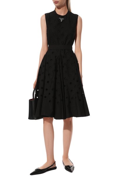 В интерпретации команды бренда платье с хищным принтом выглядит предельно эффектно и при этом благородно. Немного усмирить темперамент леопардового орнамента помогла техника омбре: спускаясь по вертикали, пятна становятся все более крупными, а фон — темным. Приталенный лиф с широкими бретелями, почти спадающими с плеч, и расклешенный подол формируют отчетливый ретросилуэт из 1950-х. Модель с застежкой сзади на потайную молнию выполнена из плотного шерстяного крепа, в который для гладкости и прочности добавили тонкий шелк.