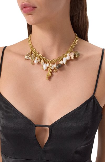 Короткое колье Kennedy добавит сияющий акцент нарядному образу. Модель из позолоченного ювелирного сплава словно собрали из крупных звеньев, в центре каждого из которых – сверкающий прозрачный кристалл драгоценно й огранки. Роль акцента отдали подвеске с перламутровым кабошоном, напоминающим жемчужину. Длина аксессуара регулируется ажурной цепочкой с небольшим медальоном.