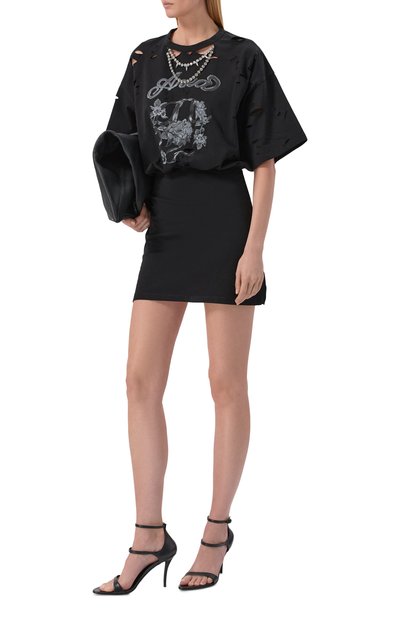 Черное мини-платье со спущенной линией плеч и короткими рукавами напоминает удлиненную футболку, дополненную широкой драпированной вставкой со скульптурным узлом на подоле. Для пошива модели использовали мягкое хлопковое джерси, которое хорошо пропускает воздух и легко тянется, не сковывая движения.