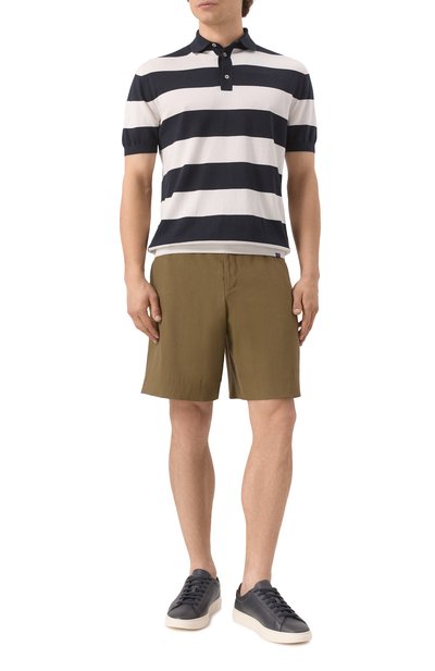 Шорты с боковыми и задними накладными карманами выполнили из мелкофактурной ткани на основе вискозы и льна. Посадка модели регулируется шнурком, продетым в кулиску на поясе со шлевками.