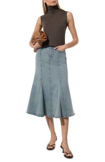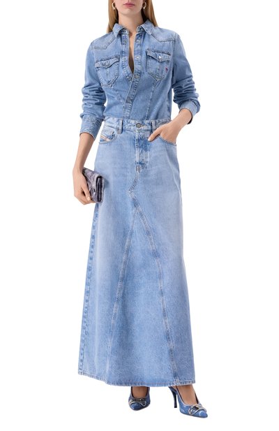 Светло-голубая расклешенная макси-юбка с высокой посадкой может стать альтернативой свободным джинсам в непринужденном повседневном образе .Для пошива модели с пятью функциональными карманами использовали плотный выбеленный деним из органического хлопка. Принадлежность бренду обозначили фирменным патчем на поясе сза ди.