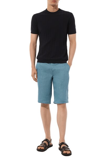 Для пошива голубых джинсовых шортов длиной чуть ниже колена использовали прочный хлопковый материал, в состав которого добавили полиэстер и стрейчевые волокна. Ткань хорошо пропускает воздух и почти не мнется, поэтому изделие долго выглядит идеально. Накладной карман сзади украсили вышитой эмблемой бренда, а пояс дополнили патчем.
