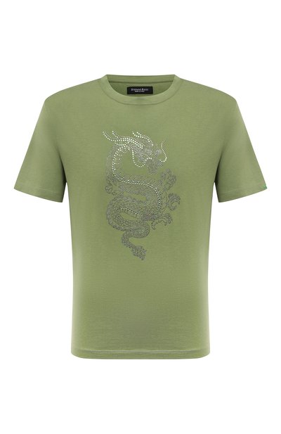 Зеленую футболку декорировали изображением китайского дракона, выложенным разноцветными кристаллами Swarovski разных размеров. Сзади под горловиной расположили логотип, указав на принадлежность бренду. Для пошива изделия использовали мягкое джерси, в котором пополам смешали воздушный хлопок и шелковистый модал.