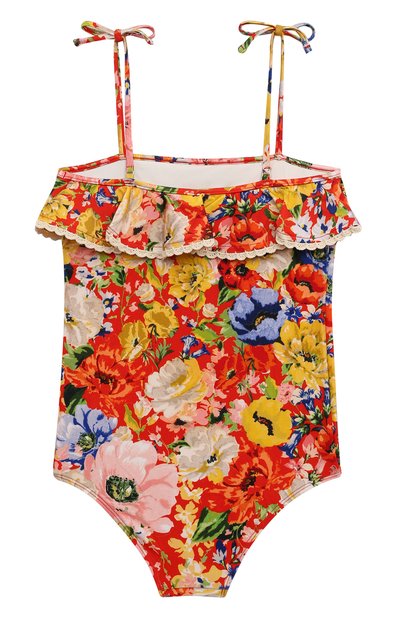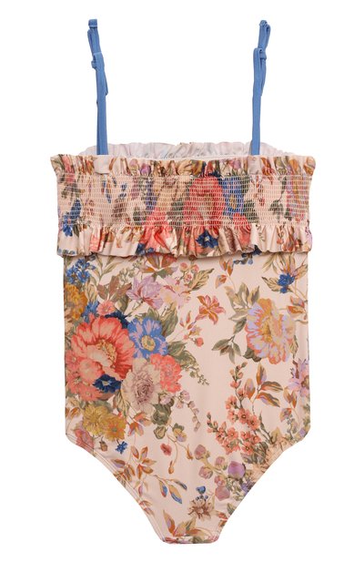 Слитный купальник в шахматную клетку нежного розового оттенка украсили разноцветным брендированным мотивом Blossom, завершив декор оборкой по краю бретелей и U-образных вырезов. Для пошива модели использовали нежную эластичную микрофи бру из быстросохнущего полиэстера, сертифицированного по стандарту GRS.