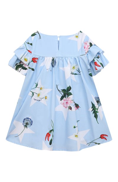 Для изготовления платья кремового оттенка использовали хорошо пропускающий воздух хлопок с разной фактурой. Верх с красочным принтом в виде логотипа, окруженного цветочным изображением сердца, сшили из эластичного джерси, а задрапированный подол с мотивом Blossom Kids — из шелковистого поплина.